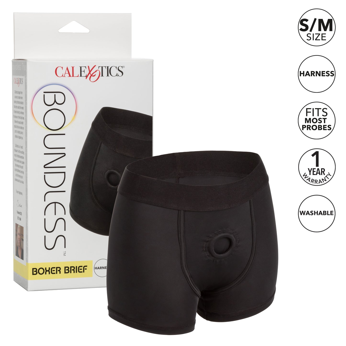 The Boundless Boxer Brief Harness is an ultra-comfortable, easy wear harness designed with powerful performance and comfort in mind. This classic harness has a supportive extra-wide waistband, soft stretchy material and internal probe straps for the ultimate support. Enjoy easy access to your favorite probe with the accommodating double panel interior design. The durable, reinforced O-ring stretches to accommodate your favorite packer, vibrator or dildo.