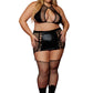Faux-leather and fishnet bralette and garter skirt set. Bralette with side cut outs, tie halter neck, and adjustable back. Garter skirt with front lace up details, side garters, and open back. (thigh highs sold separately).