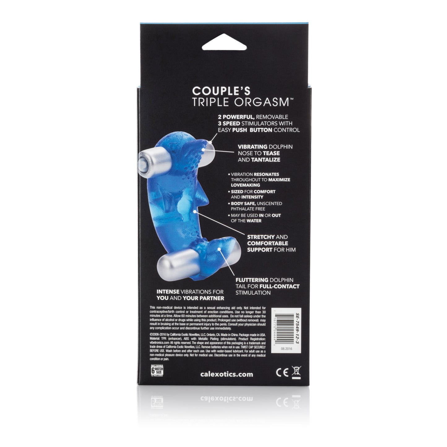 Indulge in a vibrating erection enhancer that stimulates both partners with powerful pleasure. The Couples Triple Orgasm is made of a soft, stretchy, and wonderfully comfortable TPR material that slides easily over your shaft to enhancer features two stimulators targeted at both lovers most orgasmic spots. Two bullets turn this naughty dolphin from an ordinary ring into a powerful pleasure-enhancer. Three speeds of intense vibration flow through the dolphins nose to tickle and tease her clit while you thrust. Shell love the hands-free stimulation that immerses her in allover sensation! Meanwhile, a second bullet powers the dolphins targeted tail to provide intense vibrations against her anus and your testicles. This toy has all of your sensual bases covered. The erection enhancer provides the light grip and extra pressure you need to keep your erection firm and your stamina flowing. To get started, just load each bullet with a sleeve of watch batteries (12 are included with drives you wild. Sync up the bullets for shared orgasmic stimulation or tailor each one to suit your individual moods. Your erection enhancer is fully waterproof for fun in or out of the water. Spice up your favorite positions with intense vibrations and heavenly pleasure wherever the mood strikes.