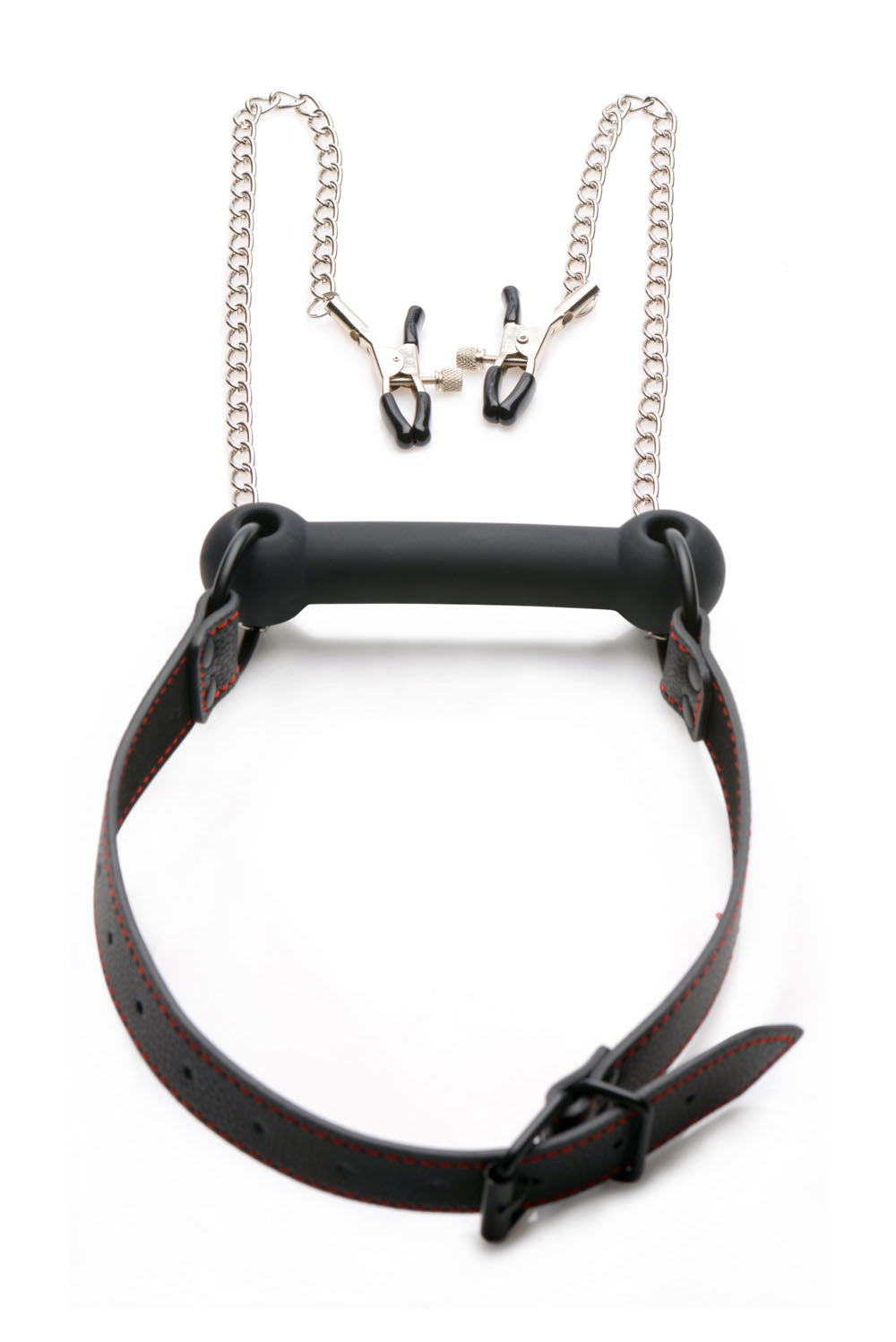 Ideal for training your pony, submissive, or slave, this combination of a bit gag and nipple clamps ensures that your plaything stays quiet, even as you deliver painful pleasure to their delicate nips! Stuff the premium silicone bit into their mouth and secure it with the soft, adjustable, red-stitched straps. The intensity of this devious device is taken up a notch with the addition of two connector chains on the metal rings that hold the gag. Each ends in an alligator nipple clamp, which allows you to adjust the pressure with thumbscrews. Vinyl coated tips make for a comfortable and secure grip. Enjoy every muffled moan and stifled gasp as you tease and torment your pet!