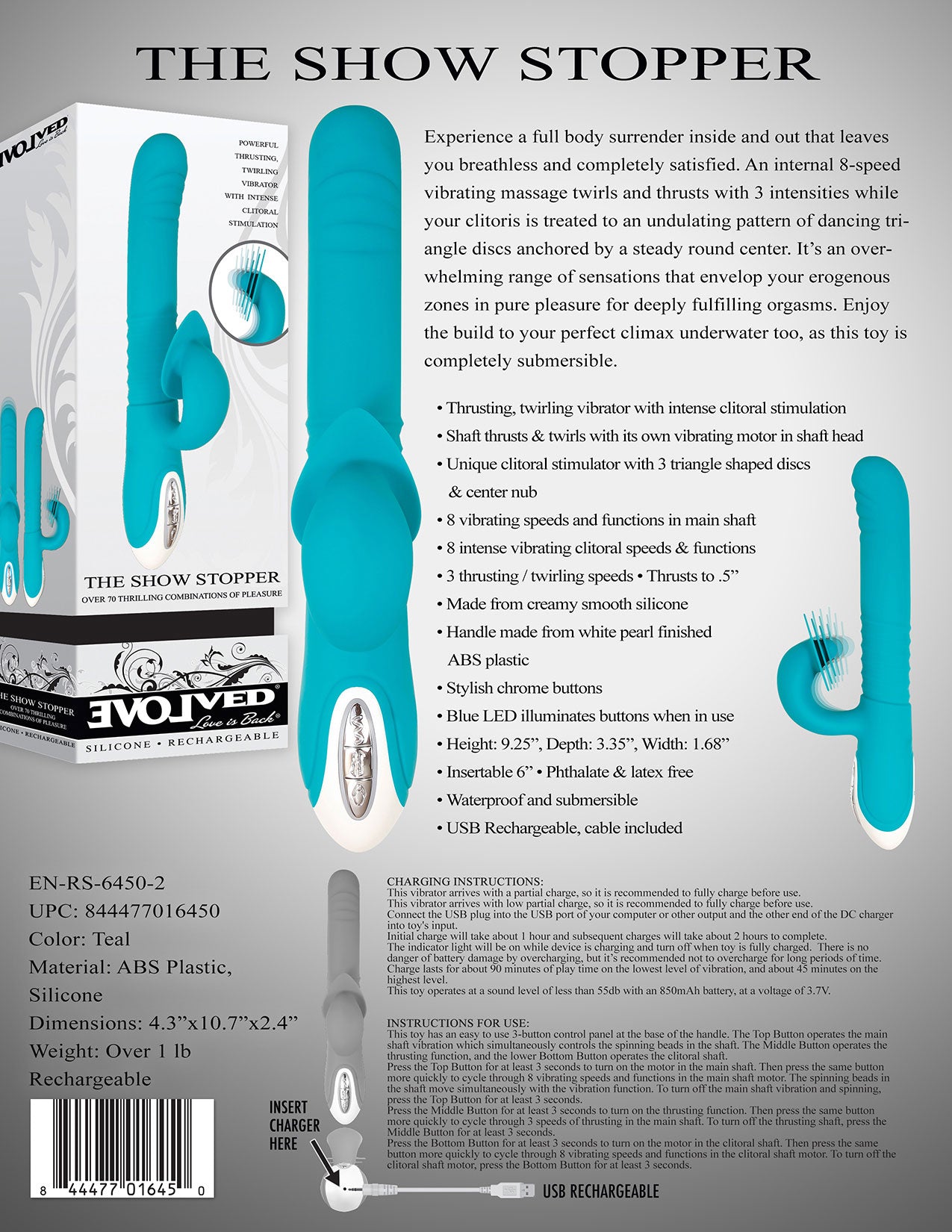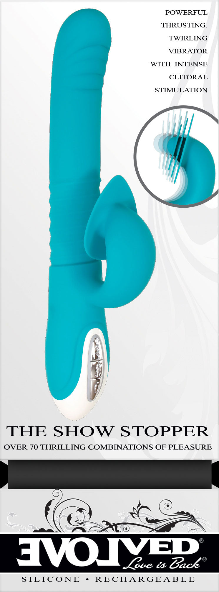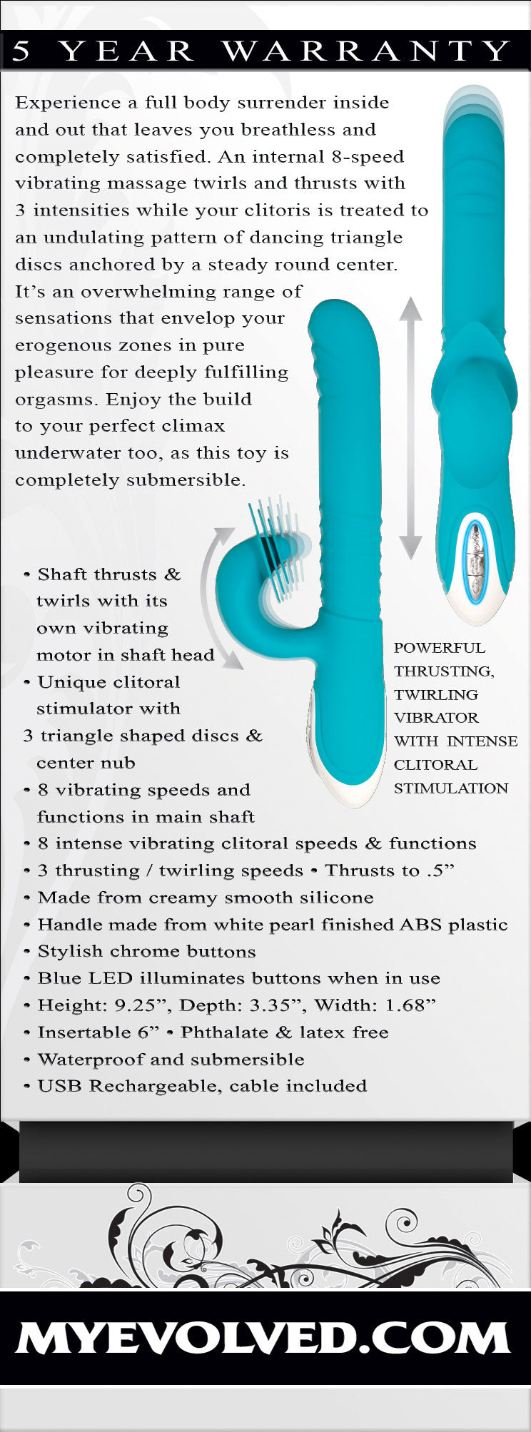Experience a full body surrender inside and out that leaves you breathless and completely satisfied. An internel 8-speed vibrating massage twirls and thrust with 3 intesifies while your clitoris is treated to an undulating pattern of dancing triangle discs anchored by a steady round center. It's an overwhelming range of sensations that envelop your erogenous zones in pure pleasure for deeply fulfilling orgasms. Enjoy the build to your perfect climax underwater too, as this toy is completely submersible.